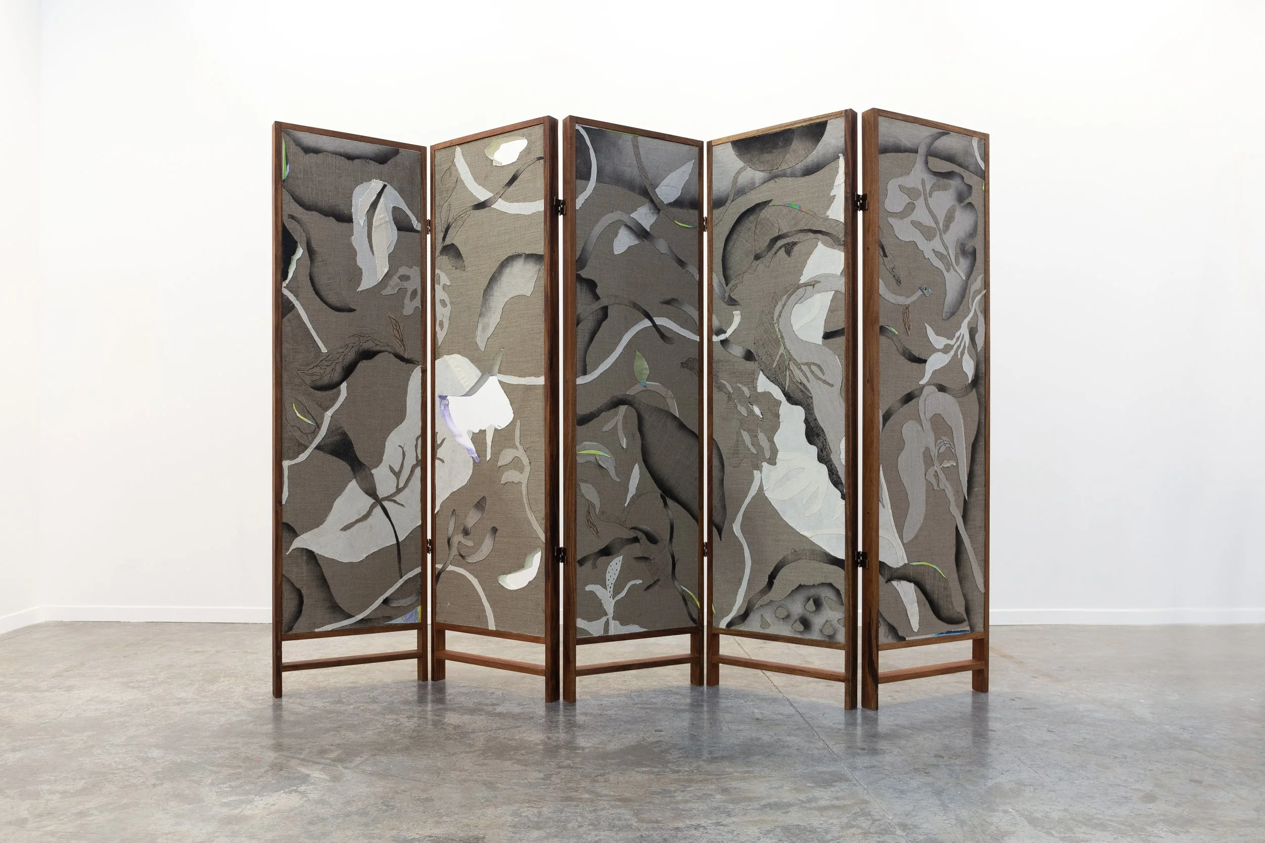 Untitled 2023 / oil and fragments of recycled paintings on linen, wooden structure / 250 x 180 cm (extended)